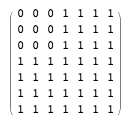 This matrix also requires 16 permutations for a proper covering. To see why, try threading permutations through the columns of the matrix, starting at the left edge and in each column choosing a 1 element (never a 0) from a different row. Because of the block of zeros at the upper left, the first three elements of every permutation must lie in rows 4 through 7. Thus each permutation “uses up” three of the last four rows in the first three columns, and the rest of the permutation can revisit this range of rows only once. It follows that each permutation can touch only one element in the 4×4 block of 1s in the lower right corner of the matrix, and at least 16 permutations are needed to cover all the 1s in the matrix. Showing that 16 are sufficient is not hard.