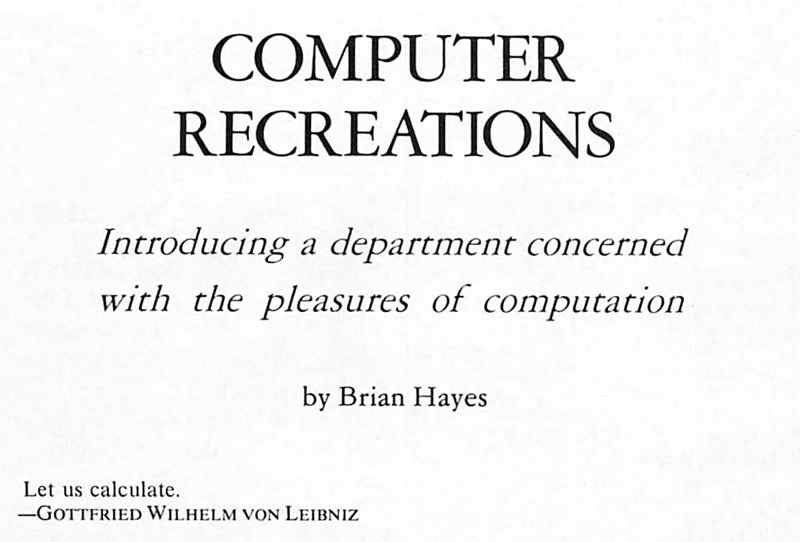 By the time IBM brought out a PC in 1981, it was clear that computing for the masses was more than a passing fad. I put together a proposal for a new department in the magazine, to be called “Computer Recreations.” Furthermore, I insisted I would write it myself. Dennis was not enthusiastic, but he indulged me. I was offered a summer of relief from other duties while I got the column started. After that, I would have to take up the editorial grind again.