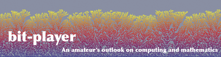 Think of a fluffy snowfall, or sediment slowly settling onto an oozy lake bottom, or the soft matt of lint on the filter screen of the clothes dryer, or the gathering of dust bunnies under your bed. These are structures created by things that clump and cluster, by drifting particles that stick to each other when they touch, that form feathery or frondlike patterns when they collect on a solid substrate. The animated banner at the top of each bit-player page illustrates some of these processes of aggregation and agglomeration. The name I have given to these simulations began as a typographical error: aglorithms.