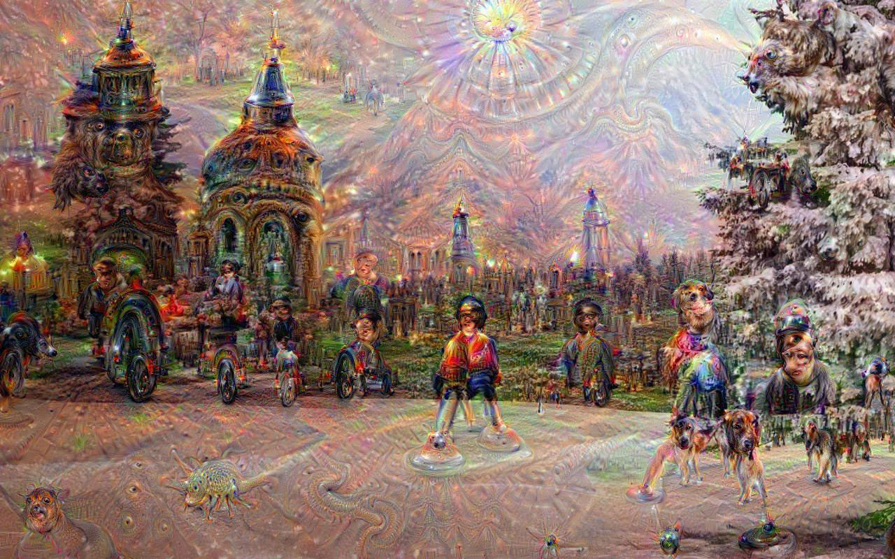 - Information flows through the layers in sequence, with any hypothesis formed in one later passed along to the later ones. You might think this would tend to stabilize interpretations. If layer 4a sees a puppy face in a certain region, then layers 4b and 4c would be influenced by this verdict. And indeed there are places in the image where certain wild fantasies do persist from one stage to the next; for example, a brightly colored vehicle first appears in the lower right quadrant in layer 4c, and it reappears with variations in the next three layers—4d, 4e, and pool4. On the whole, however, there is less continuity from layer to layer than I would have expected.