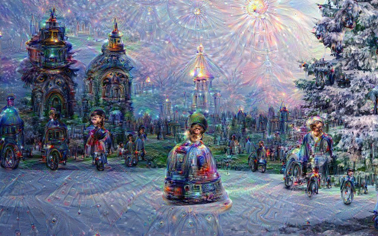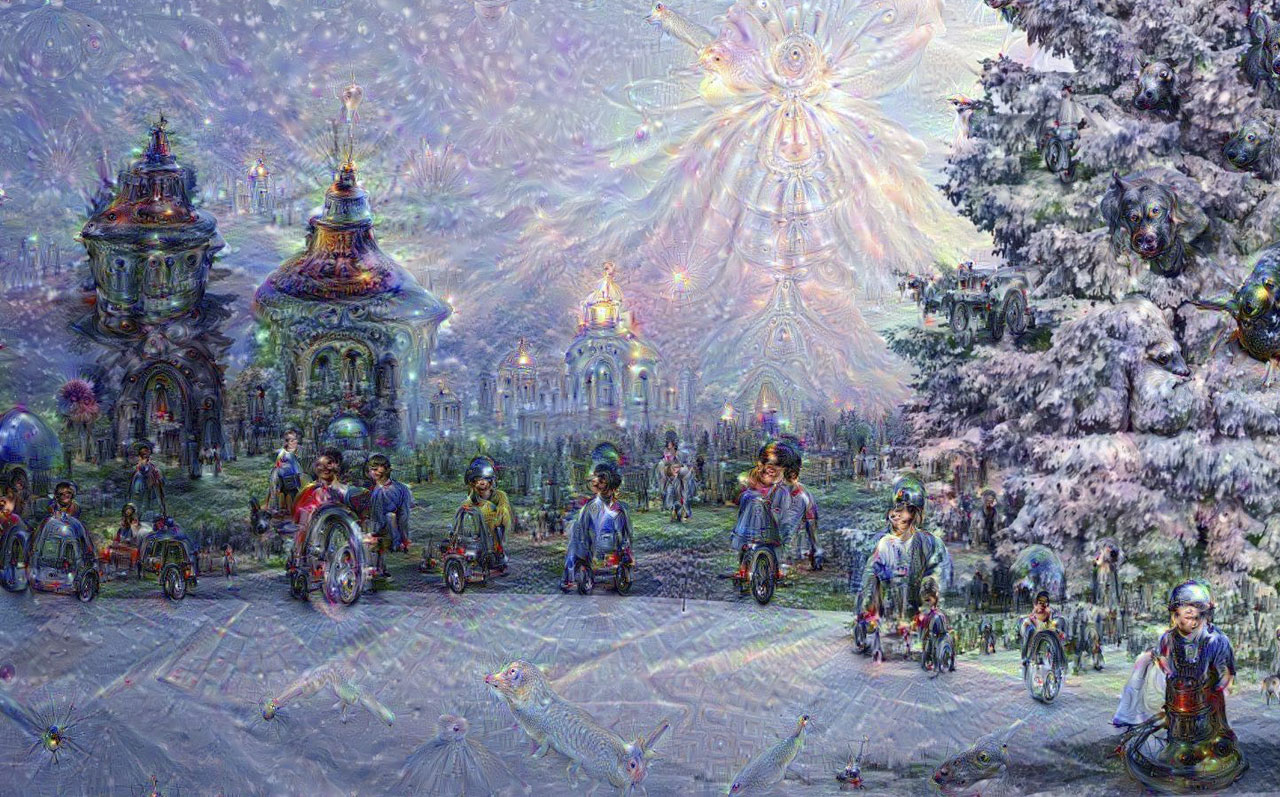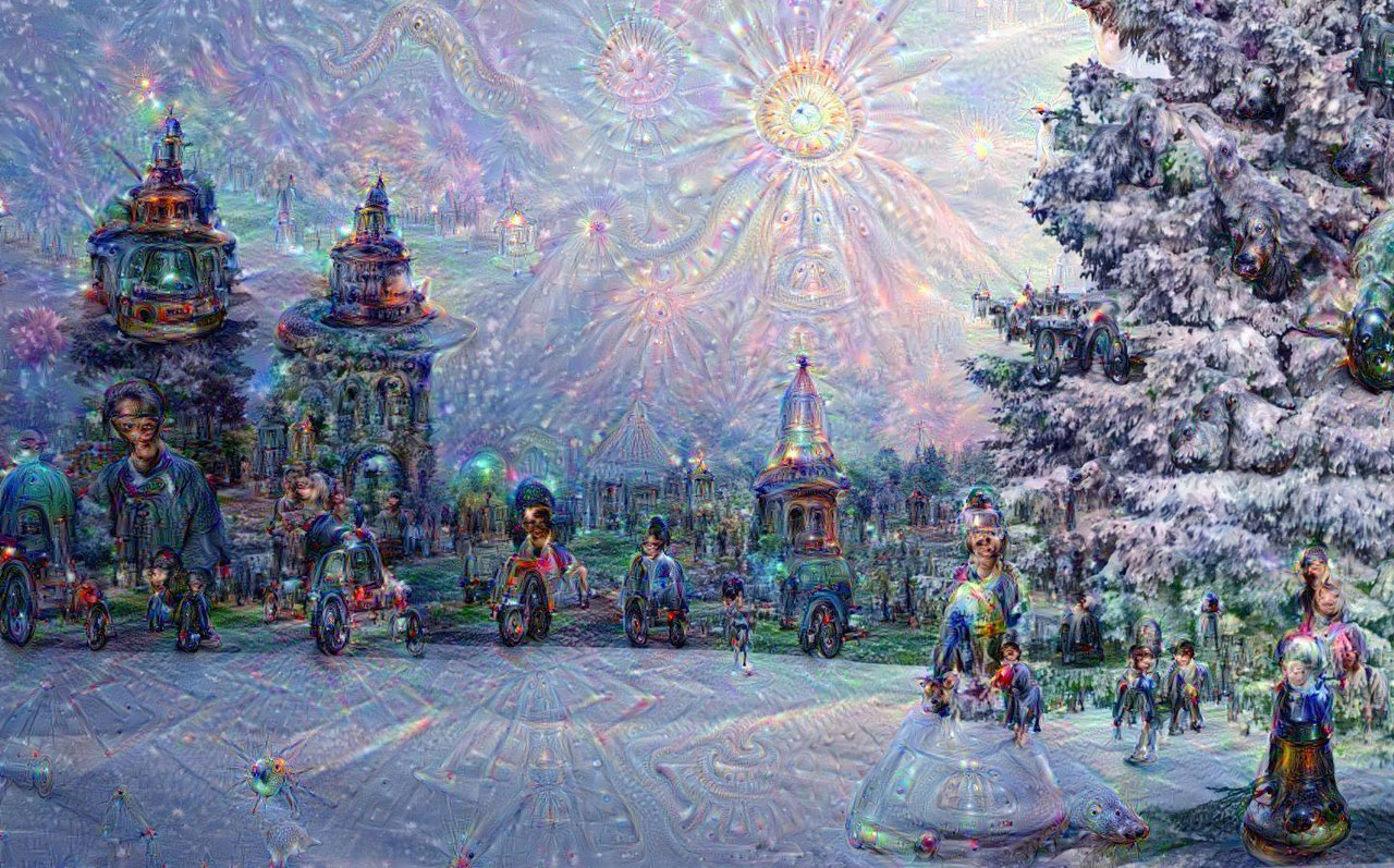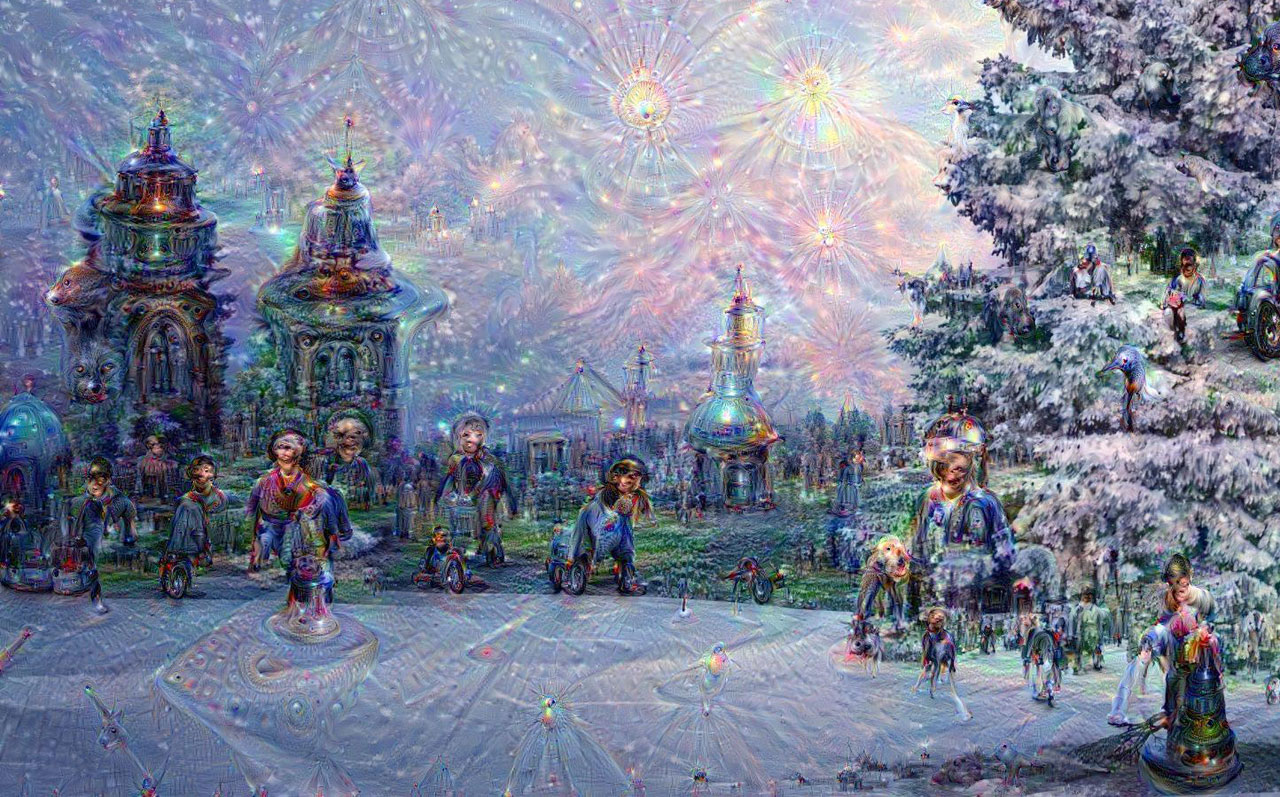 For this year’s holiday card I chose a scene appropriate to the season and ran it through the deep-dreaming program. You can see some of the output below, starting with the original image and progressing through fantasies extracted from deeper and deeper layers of the network. (Navigate with the icons below the image, or use the left and right arrow keys. Shorthand labels identifying the network layers appear at lower right.)