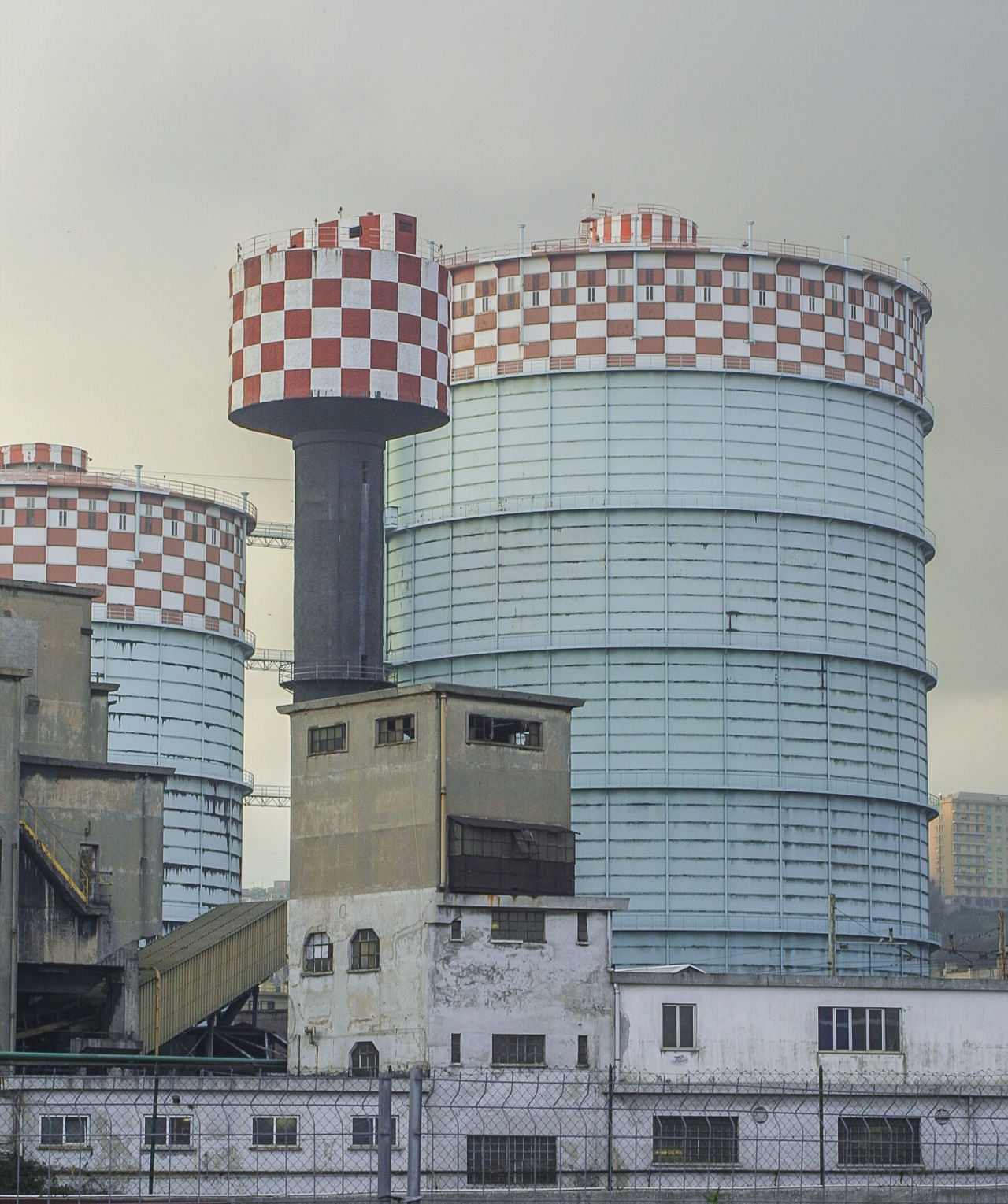 Gasholders looming over a neighborhood in Genoa, Italy, once held manufactured gas for use at a steelmill. The photograph was made in 2001; Google Maps shows the tanks have since been demolished.