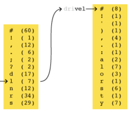 But a case can be made for a slightly different strategy, based on a preference not for common words but for common letters. A guess word made up of high-frequency letters should elicit more information than a guess consisting of rare letters. By definition, the high-frequency letters are more likely to be present in the target word. Even when they are absent, that fact becomes valuable knowledge. If you make JIFFY your first guess and thereby learn that the target word does not contain a J, you eliminate 27 candidates out of 2,315. Playing EDICT and learning that the target has no E rules out 1,056 words.