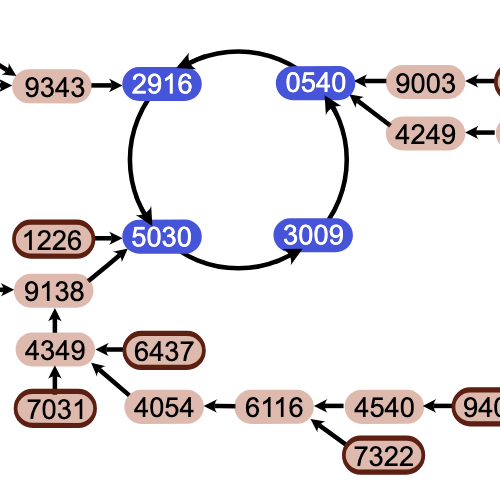 These color codes represent every feedback message you could ever possibly receive when playing Wordle. (And then some! The five codes outlined in pink can never occur. Note 2 explains why.) Each color pattern can be represented as a five-digit numeral in ternary (base-3) notation, with the digit 0 signifying gray or absent, 1 indicating gold or present, and 2 corresponding to green or correct. Because these are five-digit numbers, I’ve taken to calling them Zip codes. The all-gray 00000 code at the upper left appears in the Wordle grid when your guess has no letters in common with the target word. A solid-green 22222, at the bottom right, marks the successful conclusion of a game. In the middle of the grid is the all-gold 11111, which is reserved for “deranged anagrams”: Also OCEAN CANOE, REGAL GLARE, and NIGHT THING. pairs of words composed of the same letters but all in different positions, such as BOWEL and ELBOW, or BRUTE and TUBER.