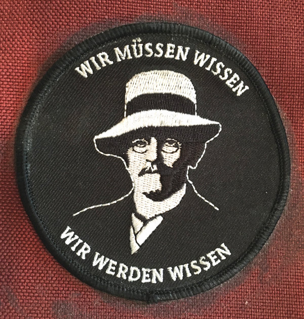 I don’t remember where I got the embroidered patch shown here. I glued it to my backpack several years ago. The fellow in the floppy Panama hat is David Hilbert, the ringleader of German mathematics circa 1900, and an agenda-setter for the worldwide math community. His slogan, “Wir müssen wissen. Wir werden wissen.” is rendered into English as: “We must know. We will know.” He spoke those words in 1930, just before Kurt Gödel published his proof that certainty and consistency are not always possible in mathematics. In other words, despite Hilbert’s ardent declaration, there are things we might never know.