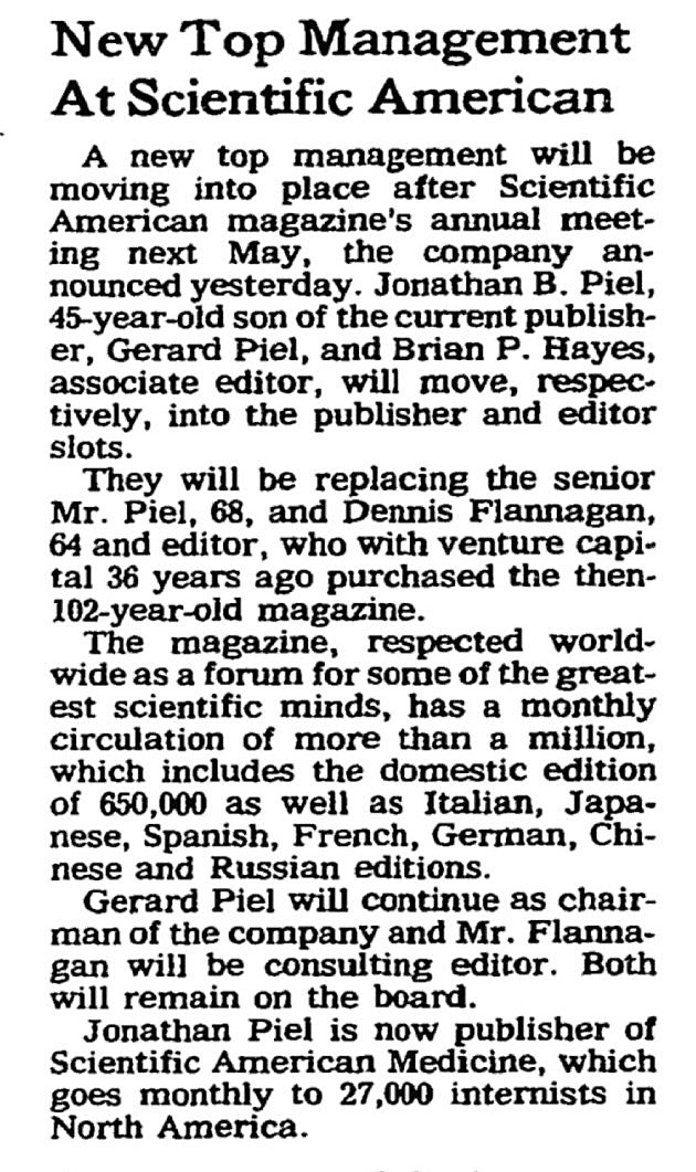 The news clipping reproduced here comes from The New York Times of January 6, 1984. It announces, among other things, my appointment as editor of Scientific American. This was a major promotion. There’s a big difference between being an editor and being the editor. I had made it to the top, and I was mighty proud of myself. But a week later I called a meeting and announced that I would not be assuming the editorship after all, and indeed I was leaving the staff of the magazine.