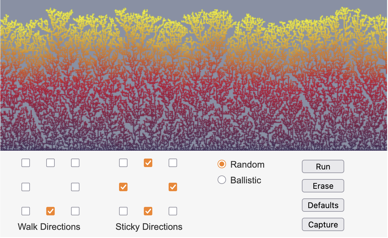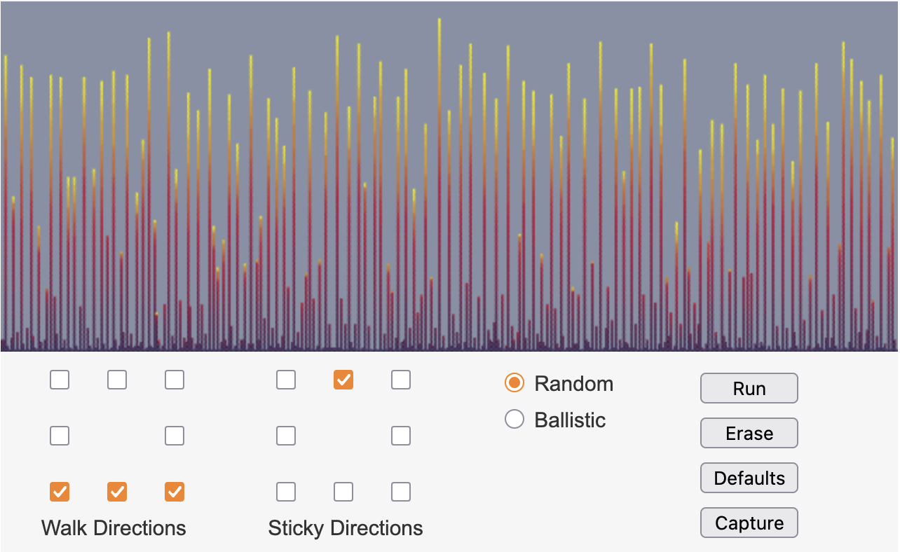 The other set of checkboxes, labeled “Sticky Directions,” pertains to the particles that have already been deposited. These checkboxes determine which sides of a settled particle are sticky and can therefore capture a new descending particle. For example, if only the top middle box is checked, then roving particles can adhere only if they happen directly on top of a settled particle.